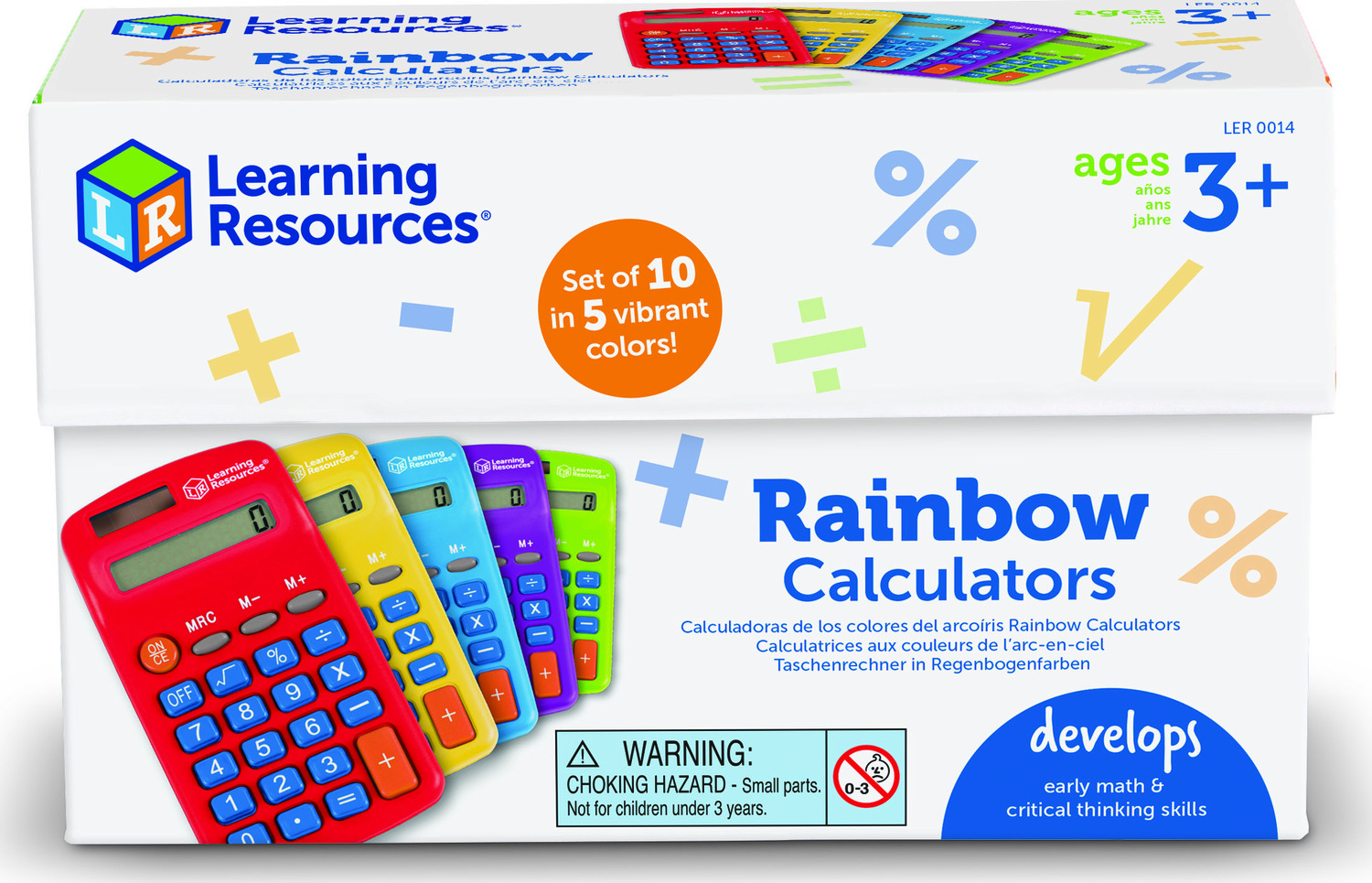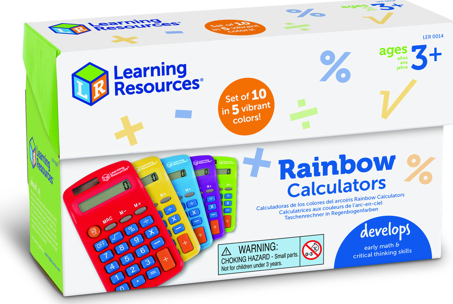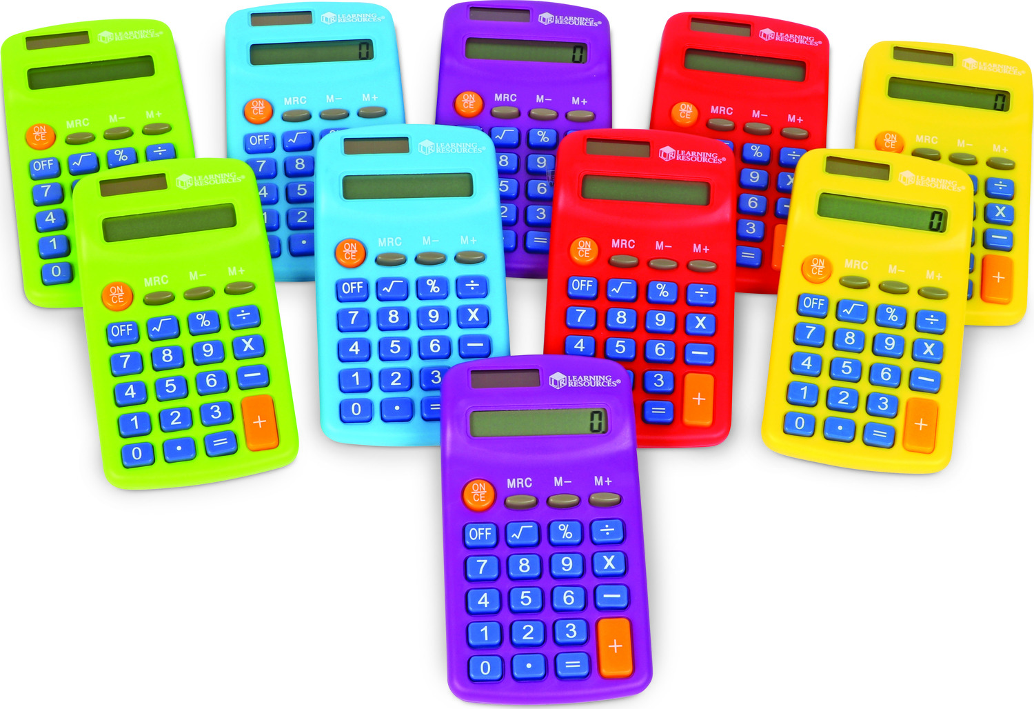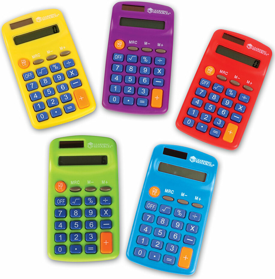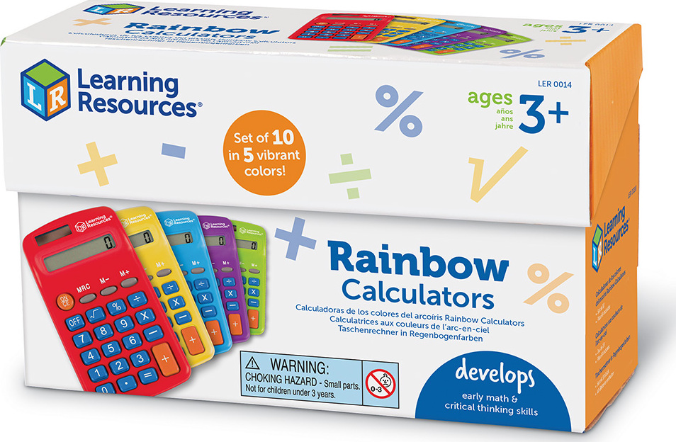 Make math colorful! Solve equations straight from the end of the rainbow with Rainbow Calculators. A fun colorful twist on Learning Resources' popular Primary Calculators, each set of 10 Rainbow Calculators comes with 5 vibrant colors. Choose from red, green, blue, orange, or purple, there's one for every day of the school week! Add some color to your elementary math classes, or brighten up the evening's homework! Although the colors may be whimsical, the Rainbow Calculators do serious work: use these 4-function calculators to check addition, subtraction, multiplication, and division equations on the 8-digit display, or discover more advanced calculations like square roots, percentages, and more! Simple to use for beginners and powerful enough for older students, Learning Resources' Rainbow Calculators grow along with your skills. Each Rainbow Calculator operates with both solar and battery power, and also includes features such as auto shut-off, 3-key memory, and more. Perfect for teacher resources and school stores!