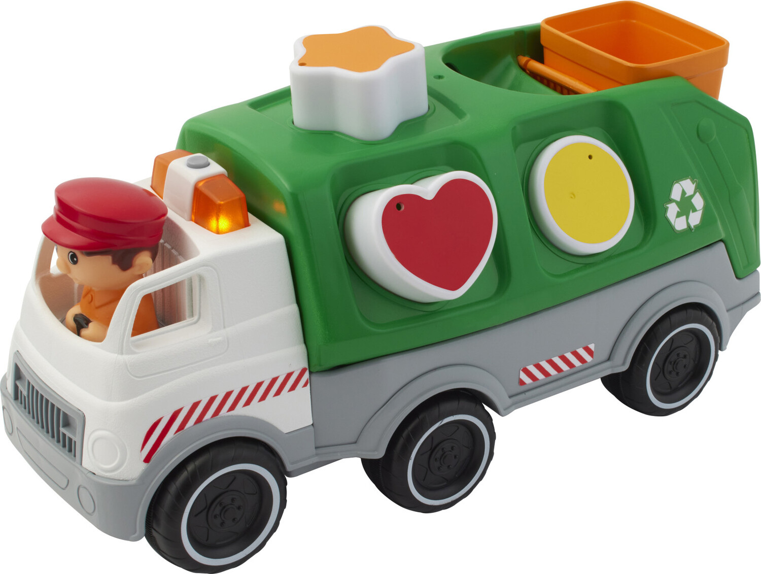 - PRODUCT SPECIFICATIONS: Package includes: motorized recycling truck, removable recycling bin, & 5 colorful shape sorting blocks. Requires 2 "AA" batteries (Included).