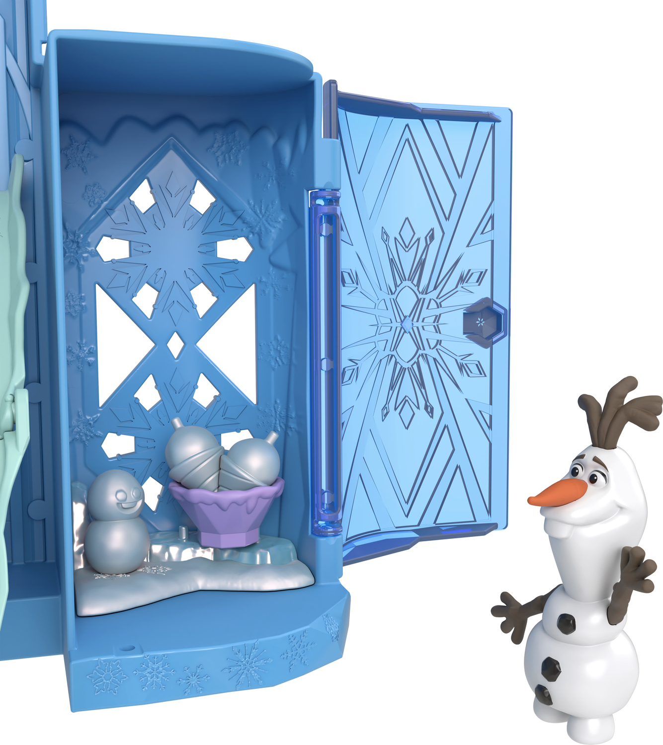 - Play areas include a fold-out slide and a sled to ride down it, an ice-inspired staircase that leads to the balcony, and a hidden room for Olaf's treasures.