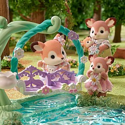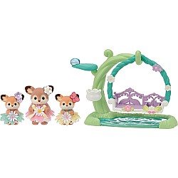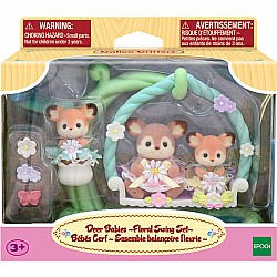 Imaginations bloom in the whimsical world of Calico Critters with this enchanting ready-to-play set. Little learners will love creating endless storytelling adventures with this beautifully detailed floral swing set, featuring three adorable deer babies. Every detail is irresistibly sweet: heart-shaped noses, removable floral dresses and hair accessories, a functional ivy swing, a lily of the valley cradle, and shimmering water ripples beneath the swing. The deer babies each have unique colors and ear patterns—the cradled twins are caramel-colored, while the standing baby is cocoa-colored with delicate petal-patterned ears. The babies can sway in the ivy swing, nestle in the lily of the valley cradle, or perch on the leaf with its glistening water droplet. Plus, flower and butterfly ear decorations add an extra touch of charm! This set is perfect for imaginative play and makes a delightful addition to any Calico Critters collection!